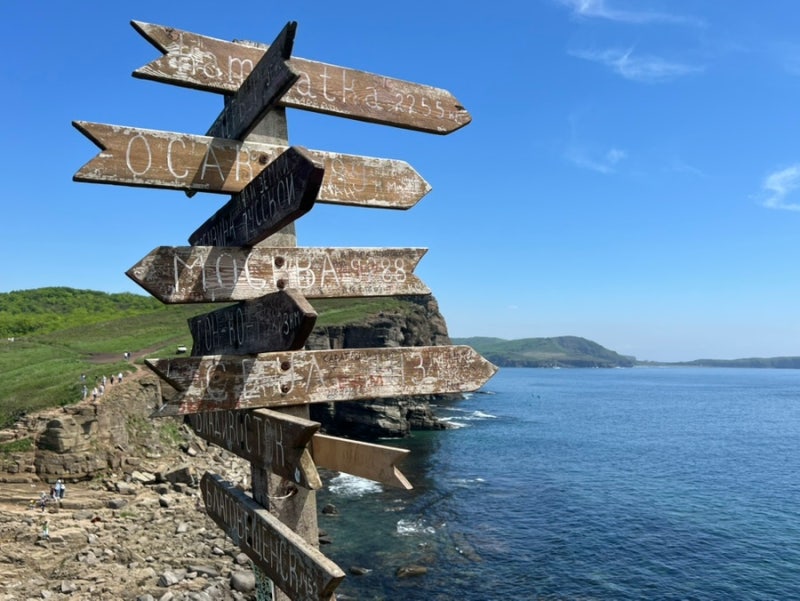 해변 언덕에 이 코스에서 유일한 안내판이 하나 서있다. 이 목제 안내판에서 내가 식별할 수 있는 글씨는 모스크바 9288, 세울(서울) 613이었다. 아마도 직선거리로 모스크바 9288Km 서울 613Km이 아니었을까?