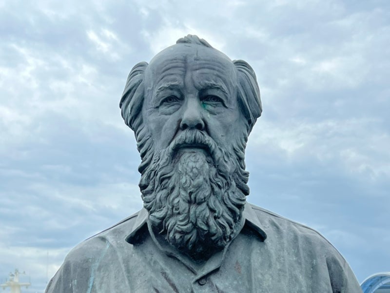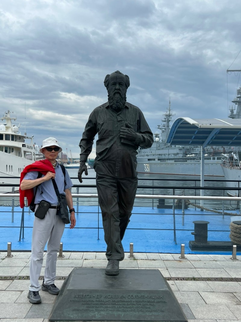 블라디보스토크 항구 해양광장에는 턱수염이 지긋한 인물이 힘차게 팔을 뻗고 있는 동상이 목격됐다. 동상의 위치는 바로 러시아 태평양함대사령부 옆 잠수함박물관 앞 광장이다. 누구일까? 1970년 노벨문학상을 수상한 작가 솔제니친(알렉산드르 솔제니친 1918-2008)의 동상이다.