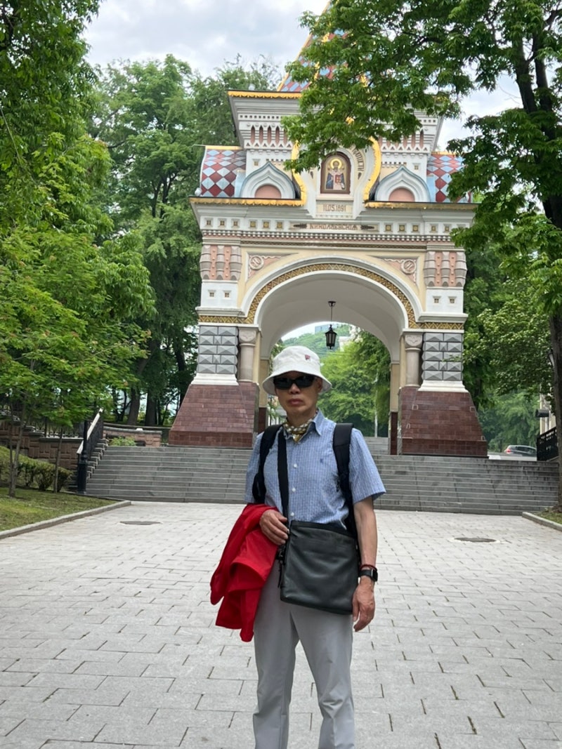 오늘의 답사일정은 블라디보스토크 시내 중심지 스베트란스카야 거리에 위치한 블라디보스토크 개선문이다. 성하의 계절, 녹음이 짙게 깔려 나뭇가지에 가려진 개선문은 머플러로 얼굴을 가린 이슬람 여인처럼 , 숨김의 미를 보여준다.