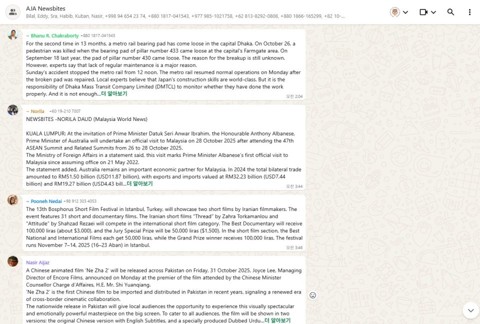 AJA 회원국의 주요 이슈에 대한 코멘트를 취합해 기사화한 ‘AJA Newsbites’는 ‘아시아엔’ 언론인 네트워크가 만들어낸 결과물이다. 현지 언론인들이 직접 큐레이팅해 서구의 관점에서 보기 어려웠던 주제들을 다루기 때문에 ‘아시아엔’만을 통해 소개되는 소식들이 대부분이다. 2025년 5월 13일 첫 회를 시작한 ‘AJA Newsbites’는 2025년 10월 27일까지 총 130회를 내보내며 ‘아시아엔’의 고유 콘텐츠로 자리 잡았다.
