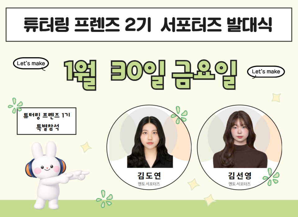 이번 발대식에서는 1기로 활동했던 김도연 멘토(충남대학교 컴퓨터융합학부)와 김선영 멘토(경희대학교 정치외교학과)가 참석해 자리를 빛내기로 했다. 이들은 발대식에 참석해 후배 서포터즈들을 응원하고, 프렌즈로서의 실제 활동 경험과 노하우를 공유할 예정이다.
