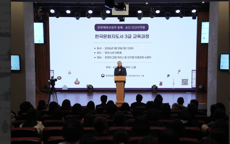 이번 ‘한국문화지도사 3급’ 과정은 한국문화의 작동 방식에 따라 △체온으로 읽는 K-문학–한강의 <소년이 온다>를 중심으로(김유순 미라클오케이 어학당 대표, 중앙대학교 현대문학 박사) △K-공연예술(윤두영 미라클오케이 어학당 공연기획 팀장, 조선대학교 K-컬처 공연기획학과 겸임교수) △K-ART(윤정미 홍익대학교 산업미술대학원 사진디자인과 교수) △K-콘텐츠(임남희 MBC 시사교양국 책임 프로듀서) 등 네 개 분야로 구성됐다.
