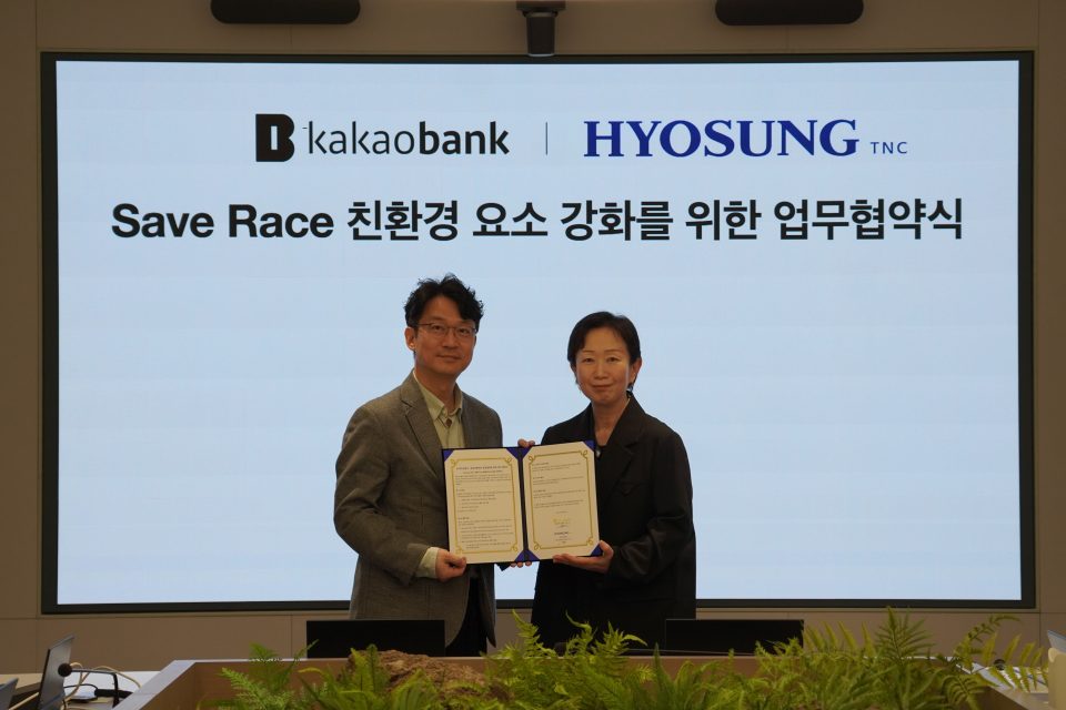 효성티앤씨는 24일 오전 카카오뱅크 판교오피스에서 ‘세이브 레이스 2026’의 친환경 요소 강화를 위한 상호 협력 업무 협약을 체결한다.