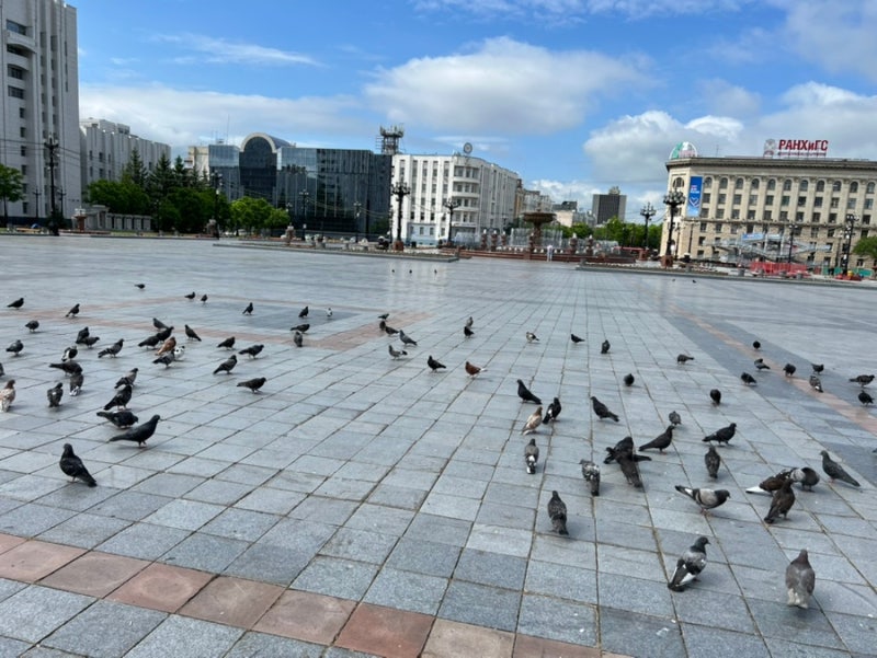 하바롭스크 레닌광장, 평화와 전쟁의 교차로에서 평화의 상징 비둘기들이 모이를 찾고 있다