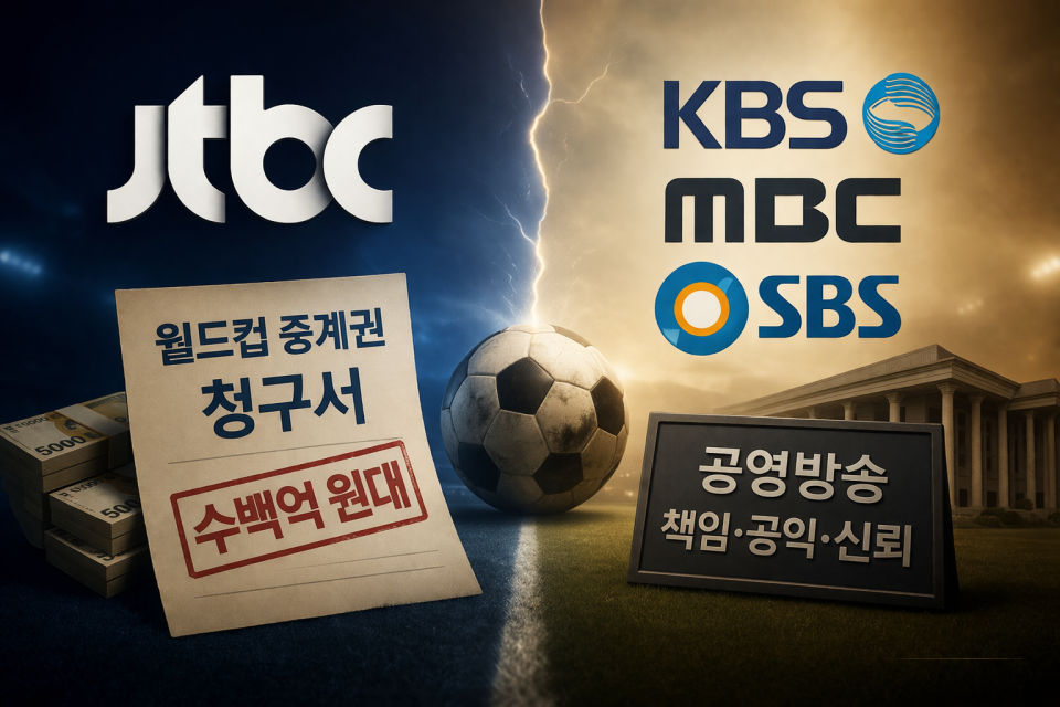 그런데 이와 유사한 장면이 최근 국내 방송계에서도 재현되고 있다. 2026년 북중미 월드컵을 앞두고, JTBC가 KBS, MBC, SBS 등 지상파 3사에 중계권 재판매, 즉 비용 분담을 요청한 상황이 그것이다.