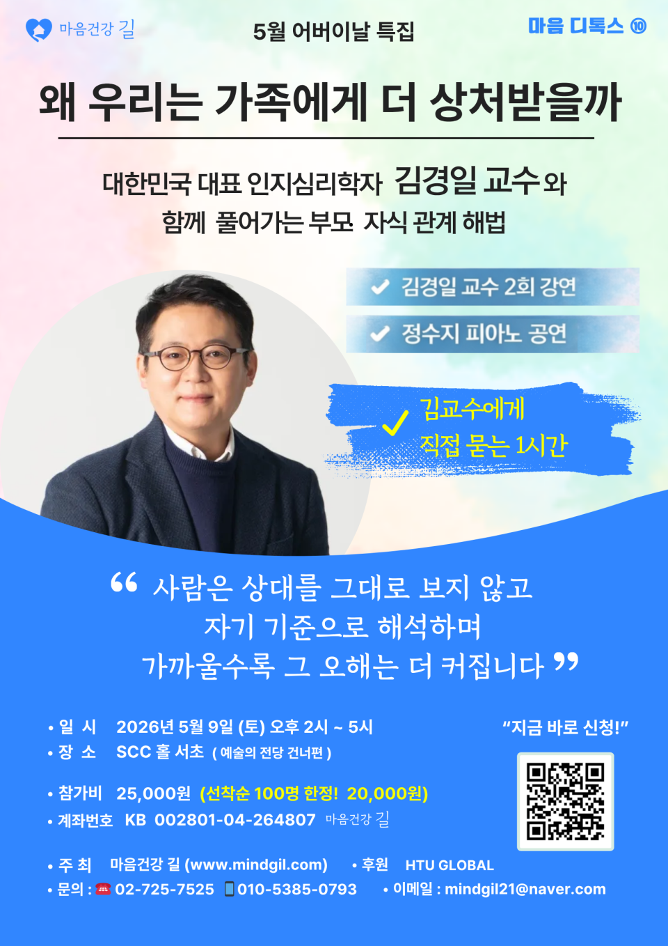 대한민국 대표 인지심리학자로 알려진 김경일 교수가 “왜 우리는 가족에게 더 상처받을까”를 주제로 ‘5월 어버이날 특집’ 강연회 를 연다. 5월 9일(토) 오후 2시부터 5시까지 서울 서초구 SCC홀 서초(예술의전당 건너편)에서.