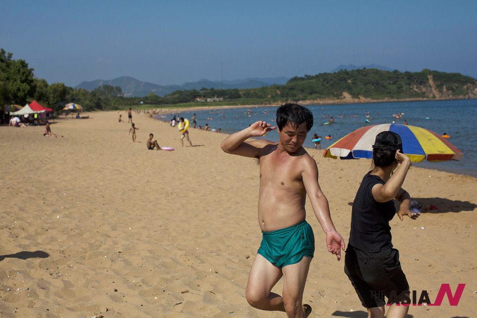 지난 8월11일 자료사진. 북한 함흥 근처 해변에서 두 남녀가 춤을 추고 있다.