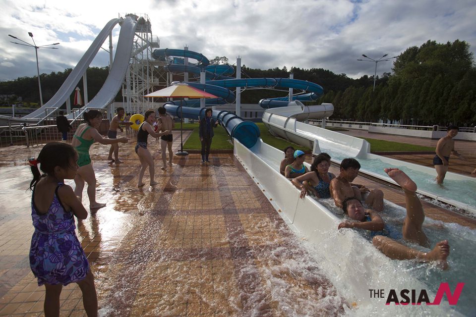 지난 9월8일 자료사진. 주민들이 평양에 새로?개장한 워터파크에서 워터슬라이드를?즐기고 있다.