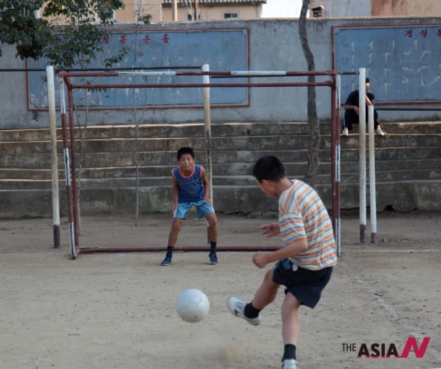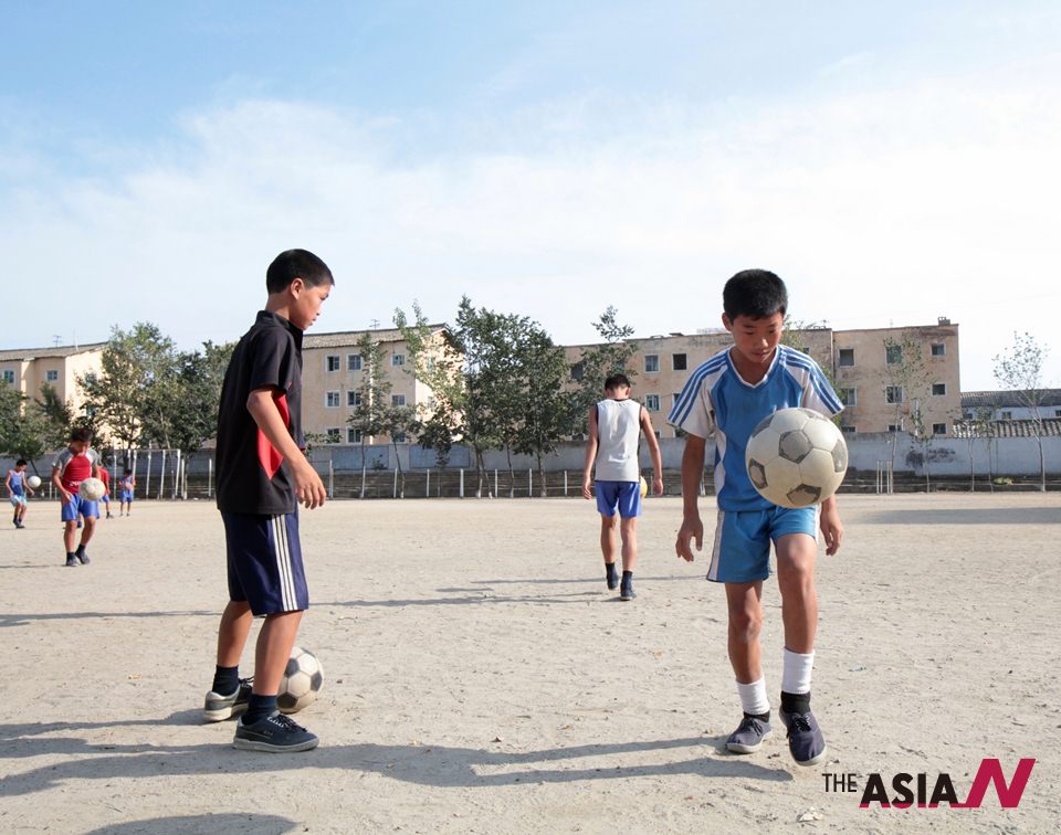 5일 평양의 한 학교에서 학생들이 축구를 하고 있다.