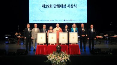 제29회 만해대상 시상식이 열린 10일 오후 강원 인제 하늘내린센터에서 올해 수상자와 내빈이 기념 촬영했다. 왼쪽부터 여중협 강원도 부지사, 윤재웅 동국대 총장, 김주연 문학평론가·다프나 주르 교수(문예대상 공동수상), 조계종 총무원장 진우 스님, 카르멘 웡 월드센트럴키친 아시아 디렉터(평화대상), 수잰 숄티 디펜스포럼재단 대표(실천대상), 강천석 조선일보 고문, 최상기 인제군수. <사진 강원일보> [아시아엔=김한수 <조선일보> 기자] “오늘…