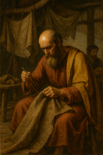 “사람들은 그런 바울을 오해했습니다. ‘바울은 사도로서 떳떳하지 못하다. 그러지 않고서야 당연한 권리를 누리지 않고 굳이 천막 만드는 일로 먹고살 이유가 없지 않나?’ 이렇게 말입니다. 준다는 사례는 왜 안 받으며 한 영혼이라도 돌봐야 할 아까운 시간에 왜 바느질이나 하고 있는지 이해하기 어렵지 않았을까요?”_본문에서. 사진은 텐트 메이커 바울(Tentmaker Paul)’의 AI 이미지. “그런즉…